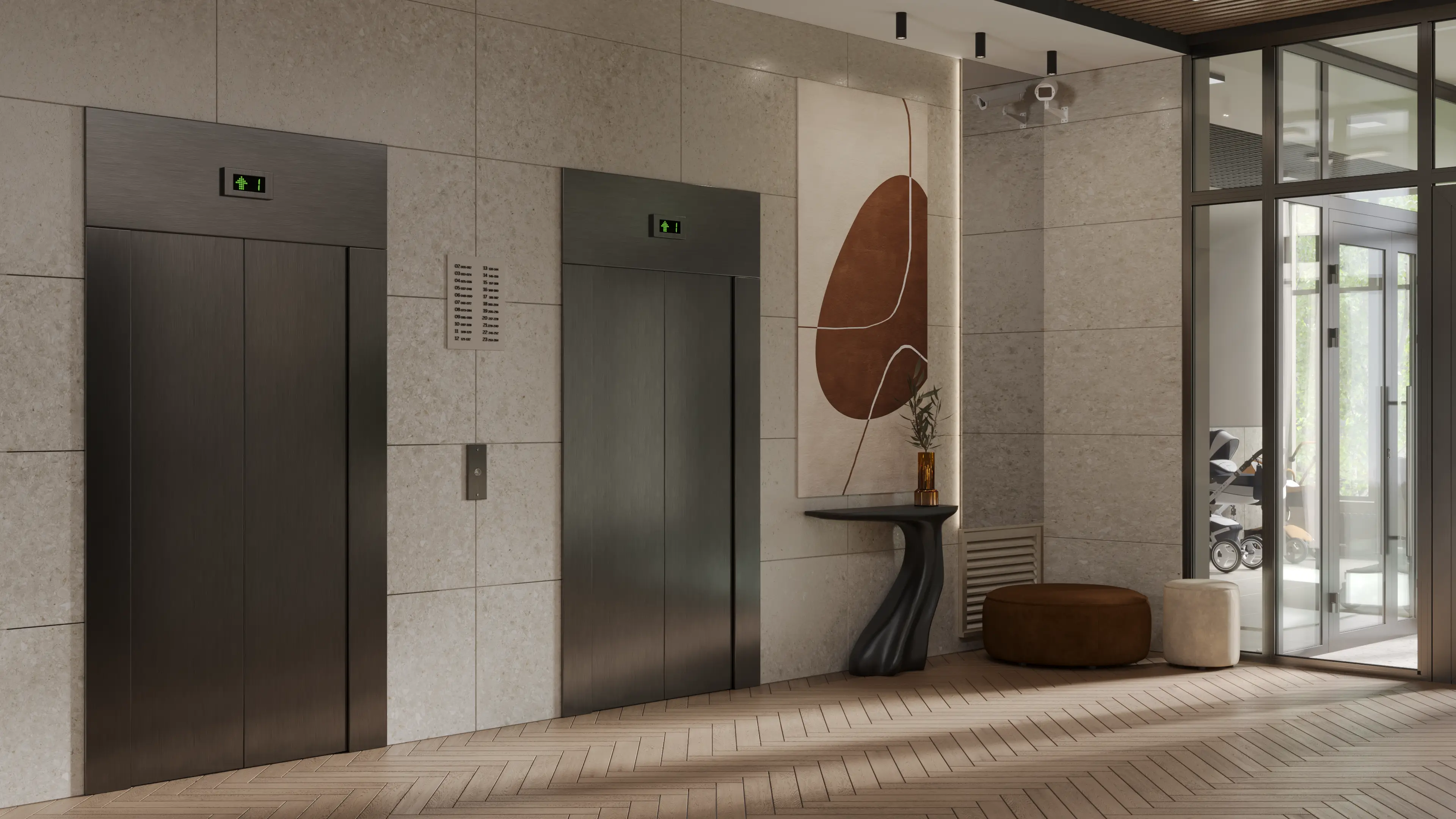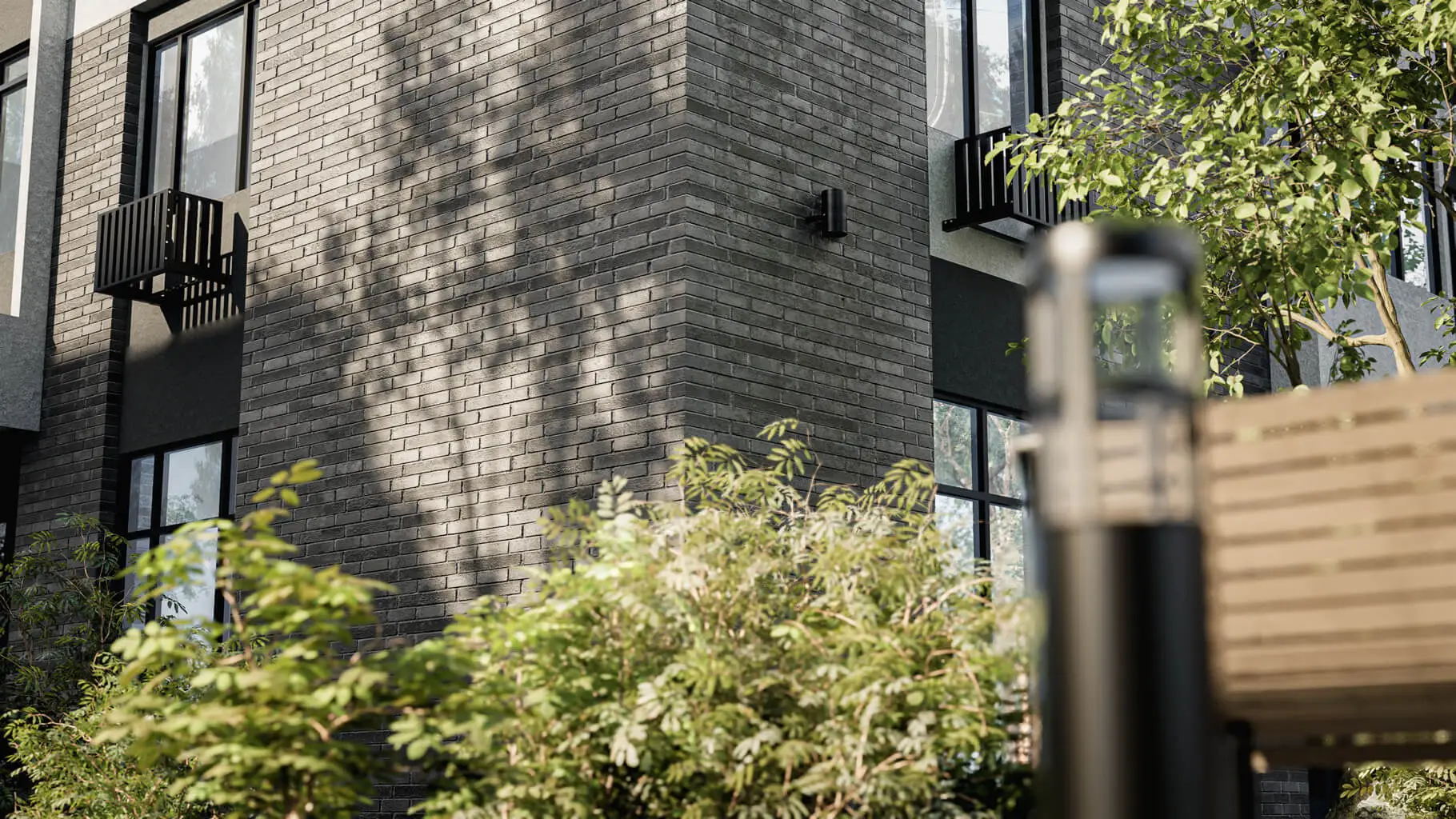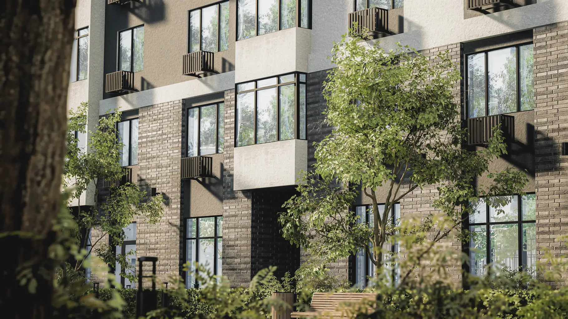 На фасаде первых этажей облицовочный кирпич. У домов первой очереди — тёмный, а у второй — бежевый.
