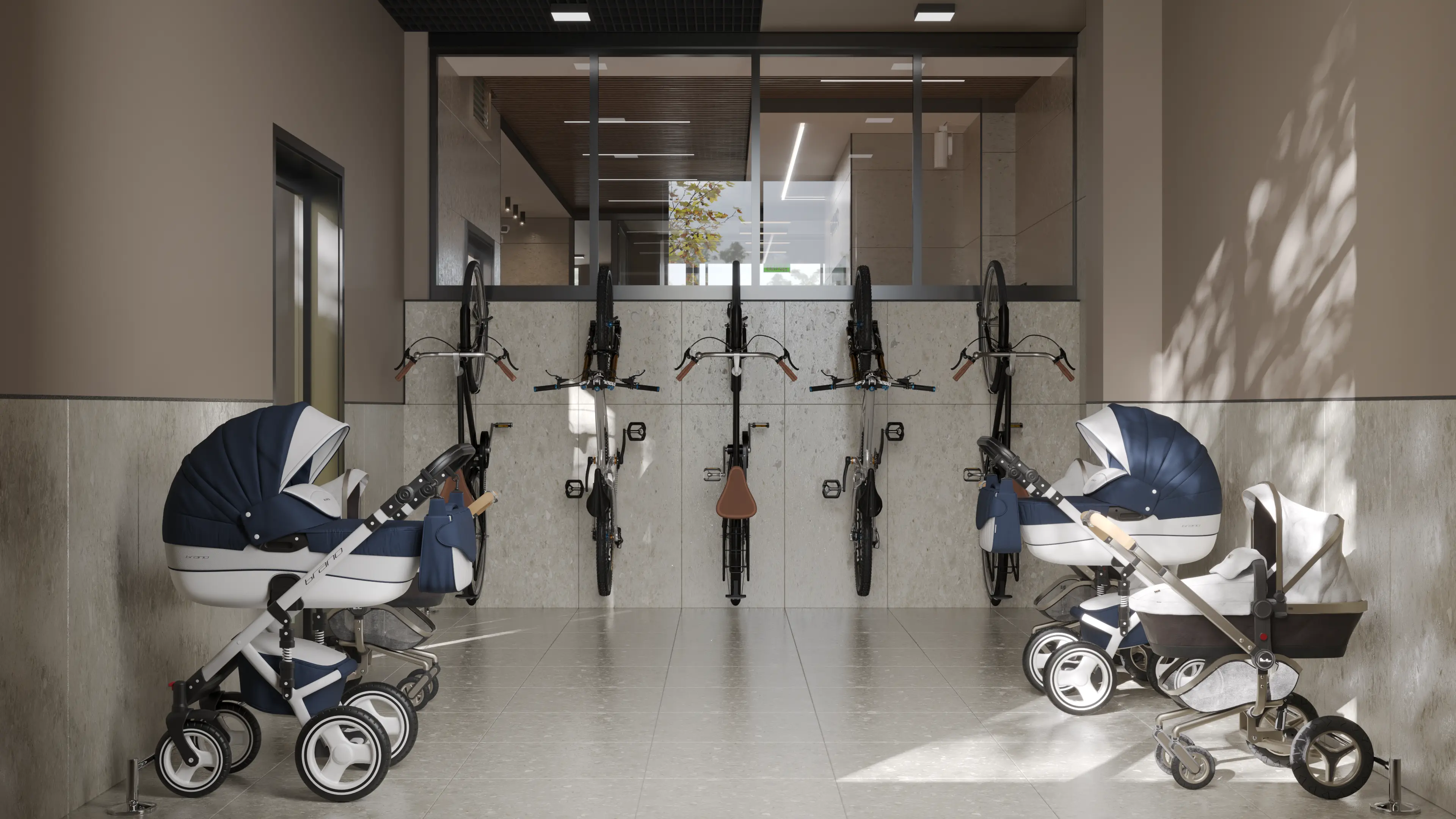 У домов закрытые дворы с тротуарами из брусчатки, велопарковками и местами для отдыха.